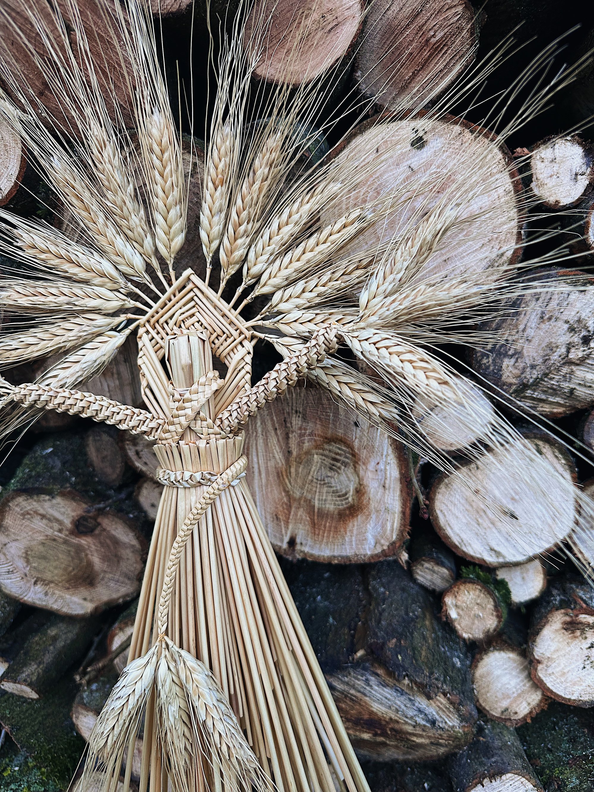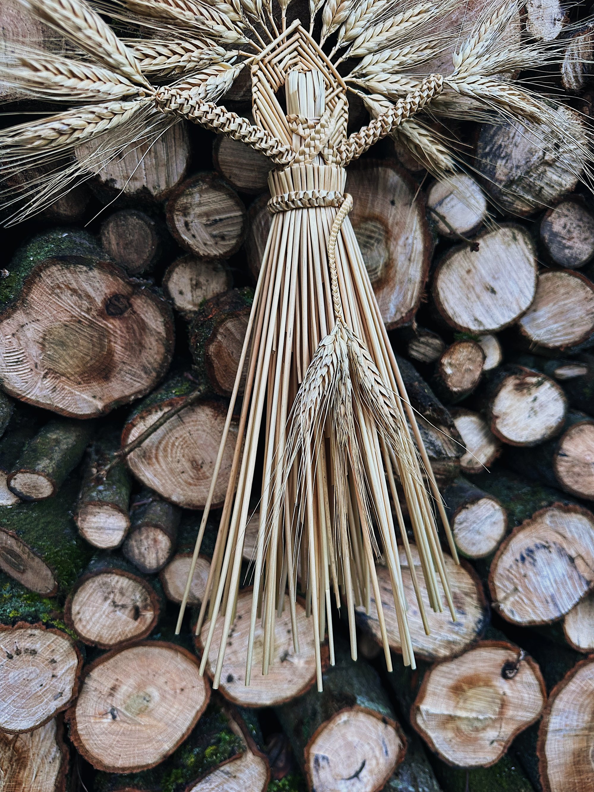 Wheat straw, linen thread and a raffia loop for hanging